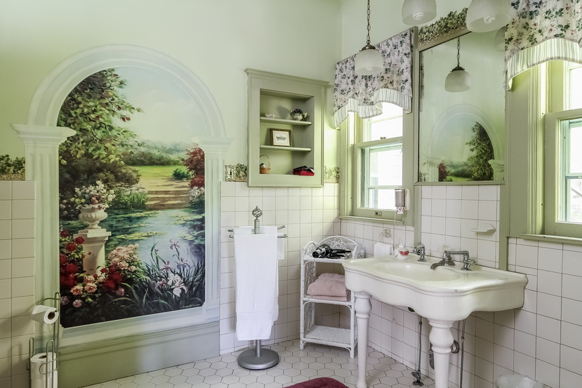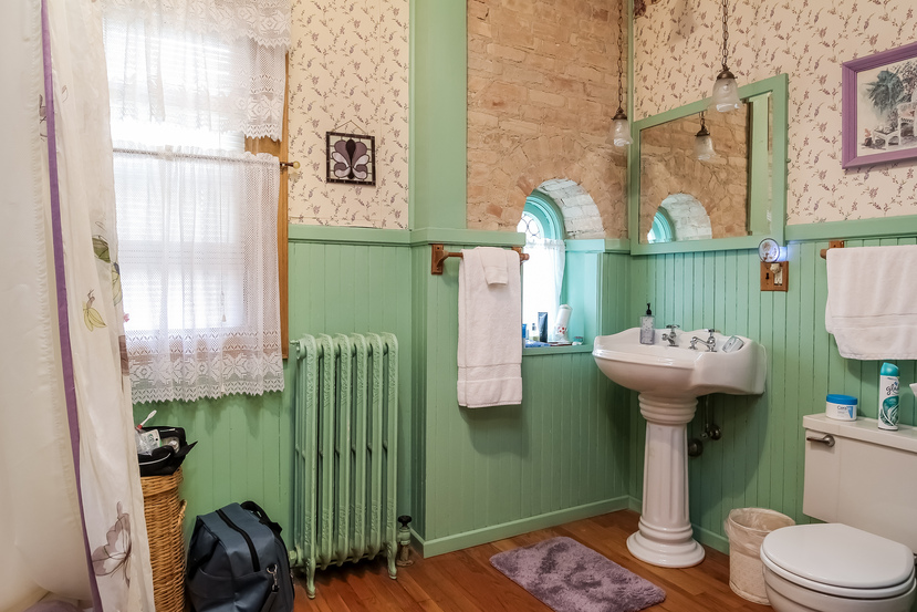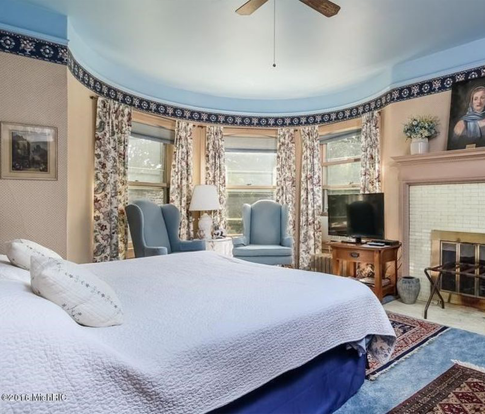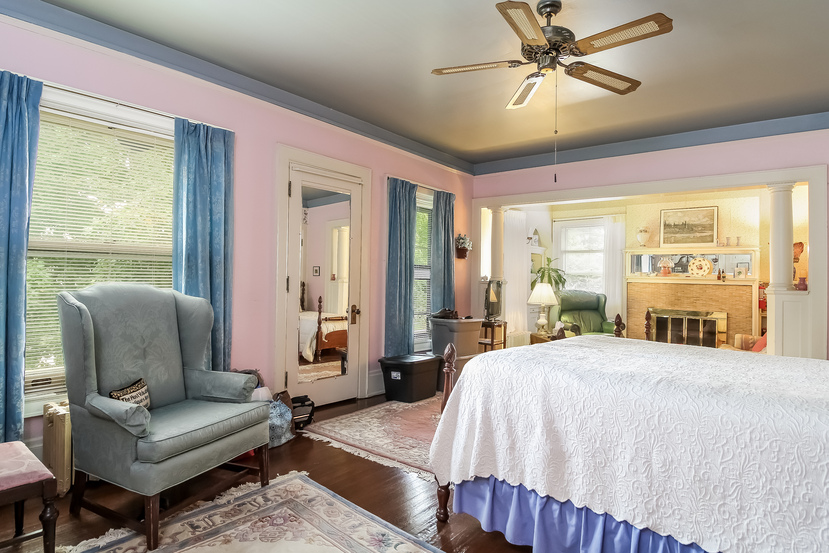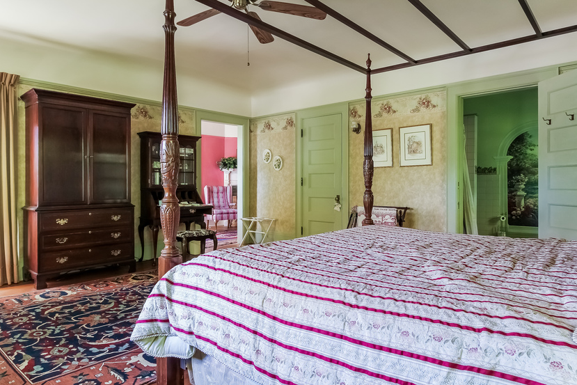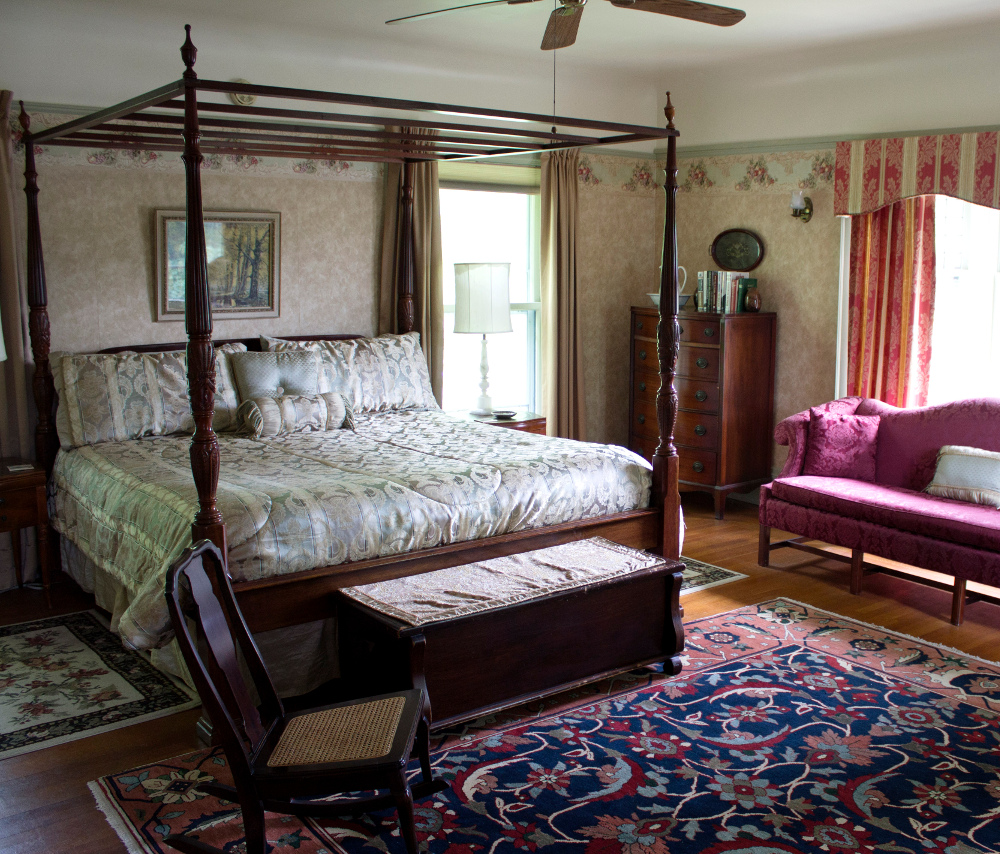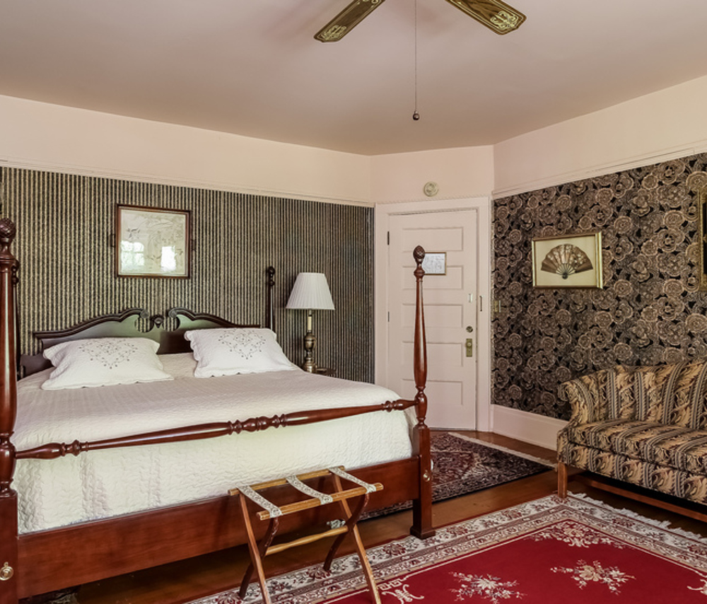 Perfect for a romantic getaway, wedding night, or anniversary. This spacious room, named for the man who built the mansion, features large windows on three walls, a king canopy bed, and sitting room with wood-burning fireplace. Furnishings are traditional and Turkish kilims adorn the hardwood floors. The attached bath has a spacious whirlpool tub (with shower) and original sink basin. AC, TV, individually controlled heat. Can accommodate 1-2 rollaways if needed.