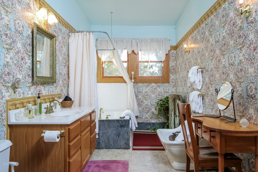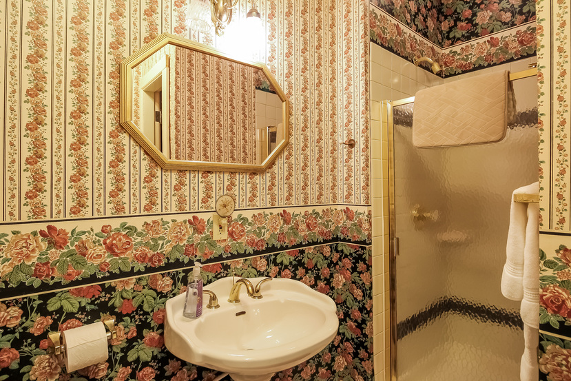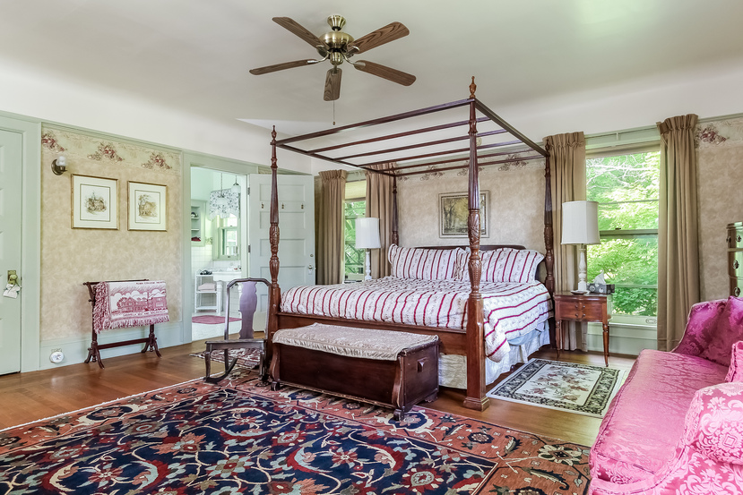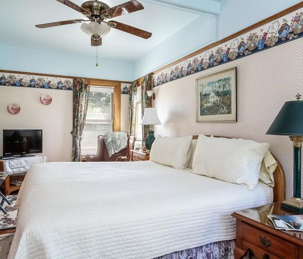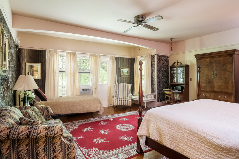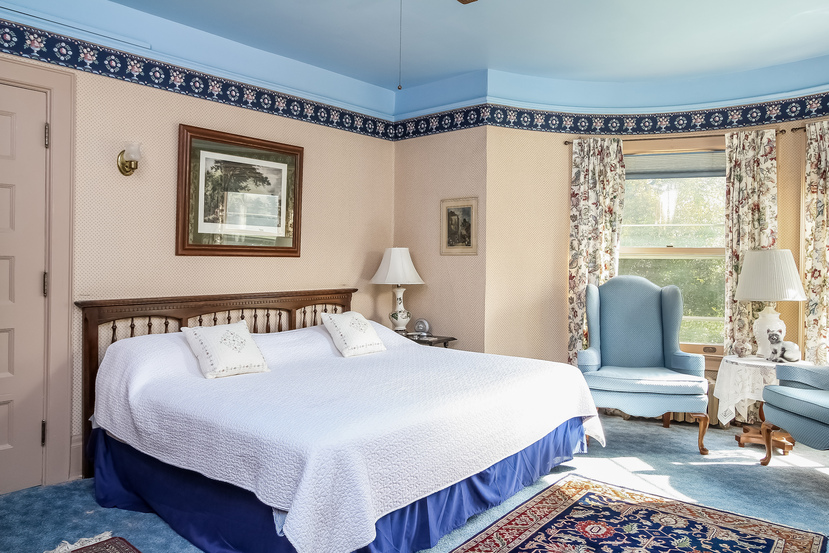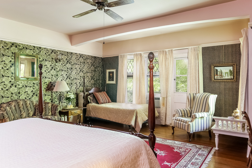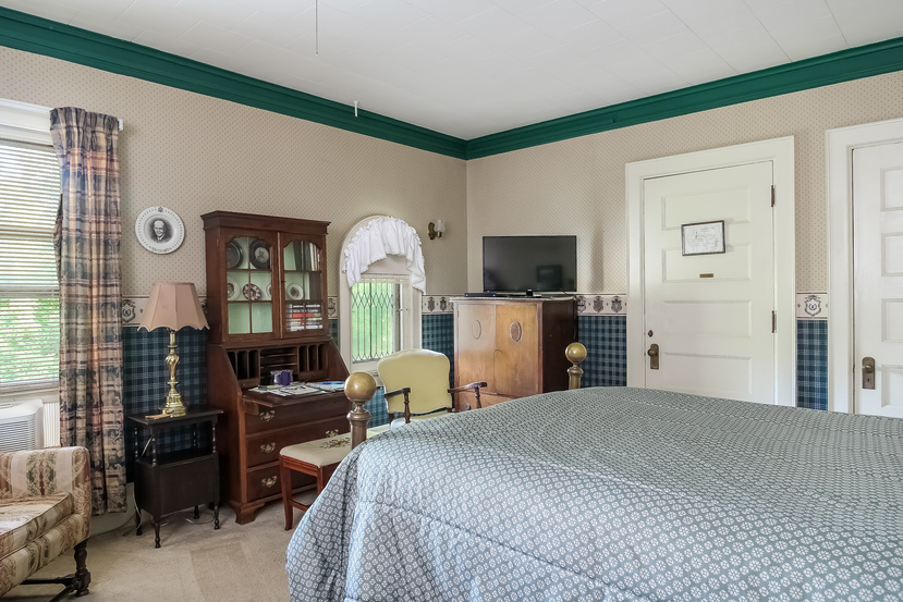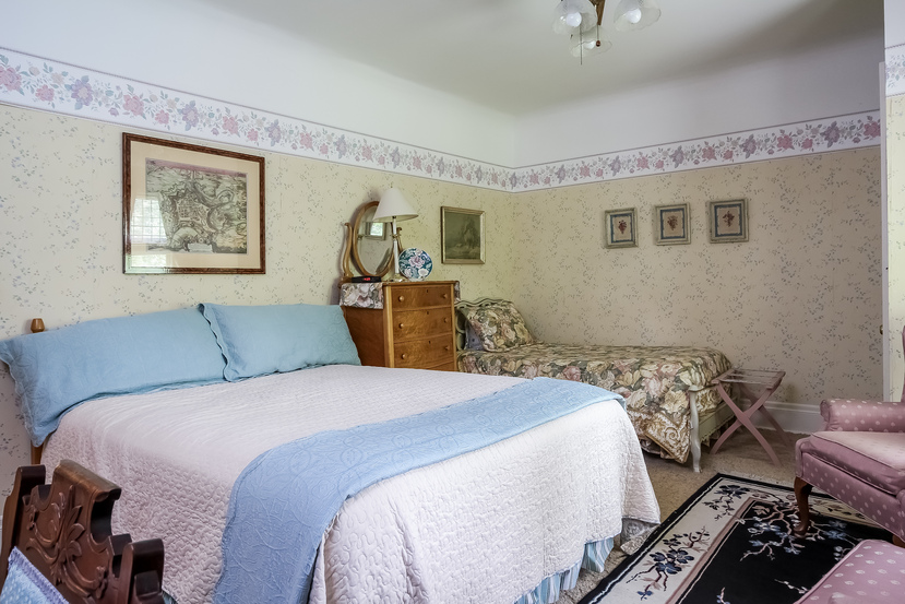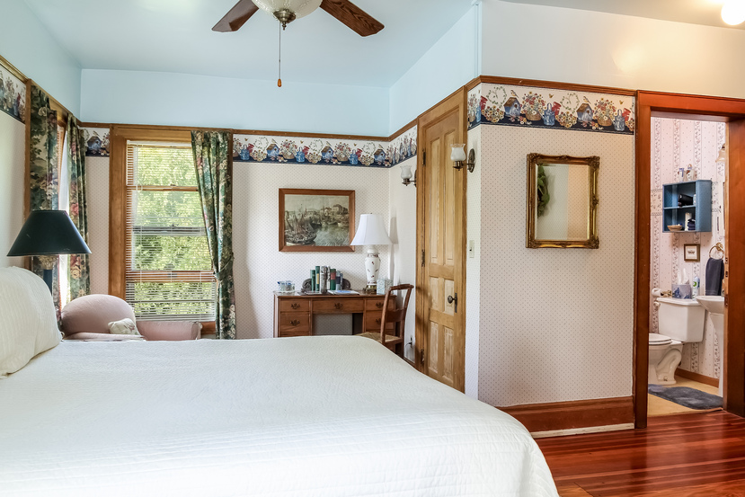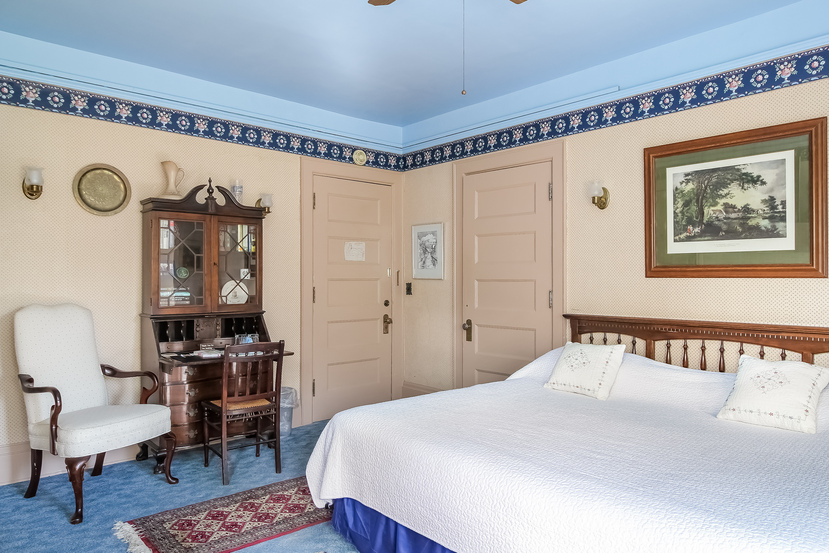 Features traditional furniture with a king bed and a twin bed, seating area with loveseat and wing chair, antique secretary/desk and elegant armoire. Hardwood floors are covered with carpets from Turkey and Belgium. The en suite modern bath has a large shower and elegant wallpaper. AC, TV, individually controlled heat. Spitler Room can accommodate a rollaway if needed.