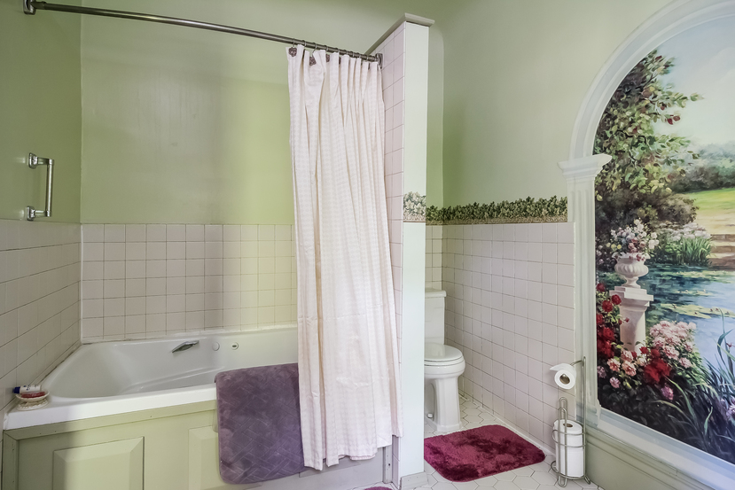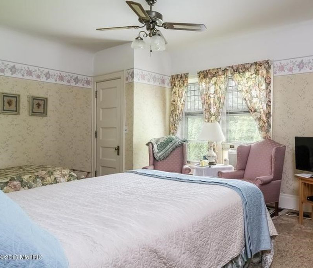 Features Scottish plaid decor, a queen four-poster antique brass bed and a turn-of-the-century 3/4 bed, and a secretary desk. Private/detached bath has original ceramic tile, large corner shower, and non-functional fireplace. AC, TV, individually controlled heat.