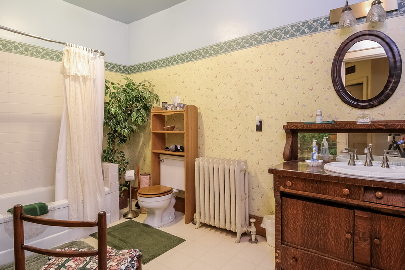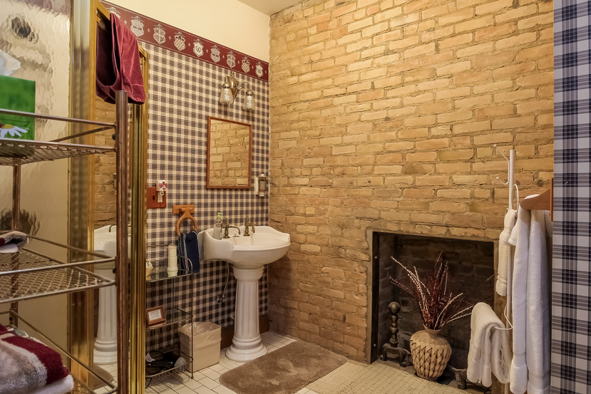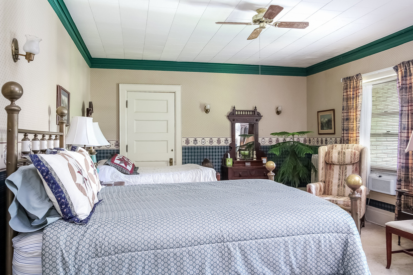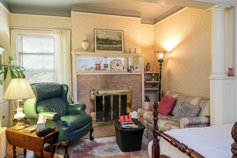 This large room bears Sara's married name It was indeed her own bedroom and, as such, one of our largest guestrooms. It features a queen bed and a twin bed, a comfortable sitting area (loveseat & leather recliner) around the wood-burning fireplace, and the original hardwood floor that is now covered with Chinese handmade rugs. The private/detached bath has the original tub (with shower). AC, TV, individually controlled heat. The Lancashire Room can accommodate up to 2 rollaways if needed and is ideal for family groups.